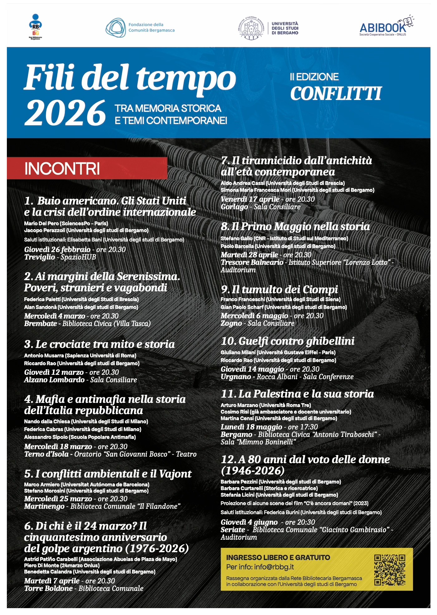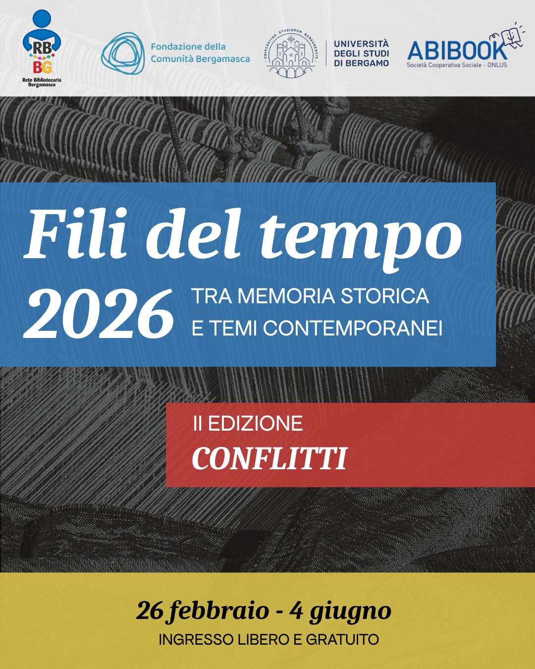 Fili del Tempo è una rassegna a carattere storico organizzata da Rete Bibliotecaria Bergamasca in collaborazione con l’Università degli studi di Bergamo. Nasce dalla volontà condivisa di offrire ai cittadini un percorso culturale di alto livello, access
